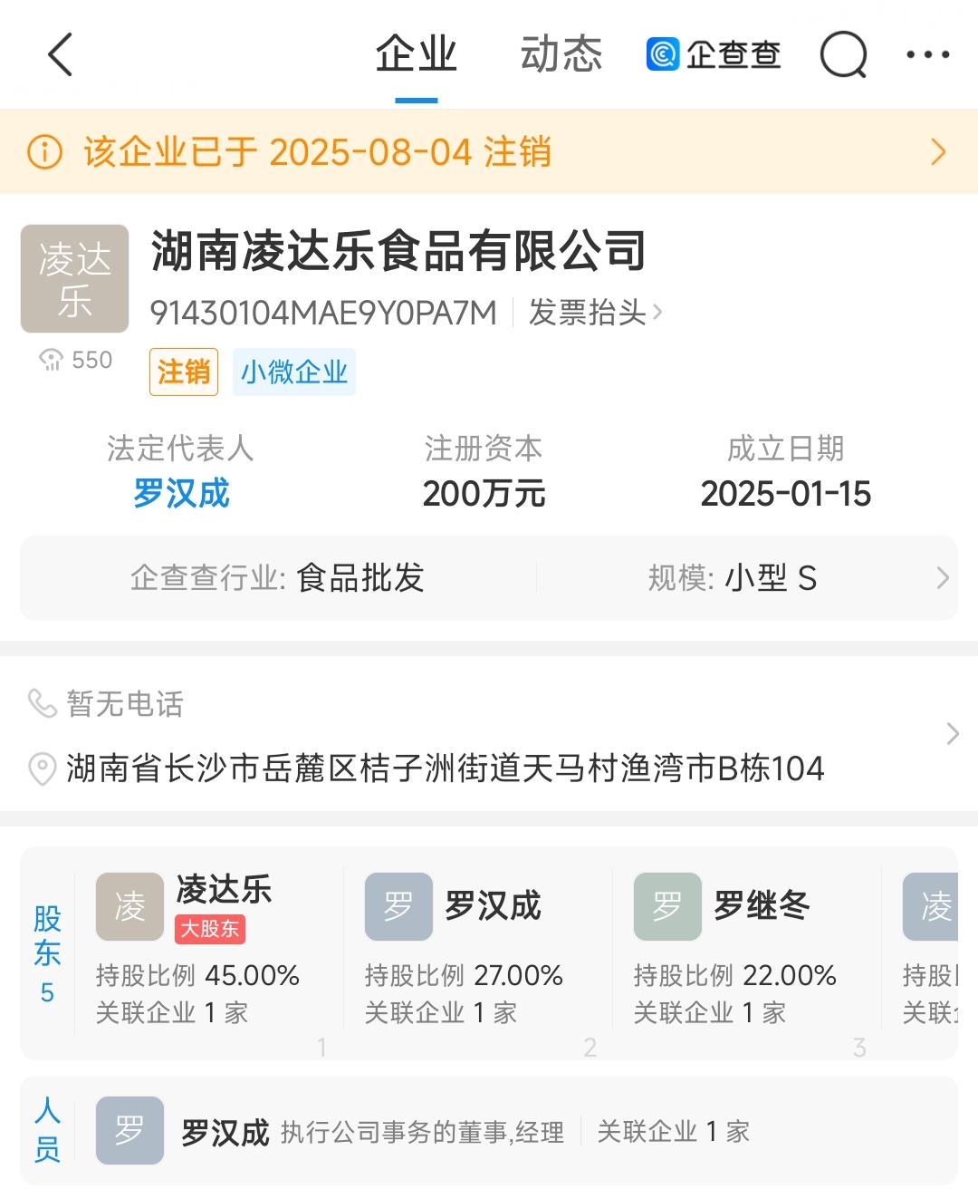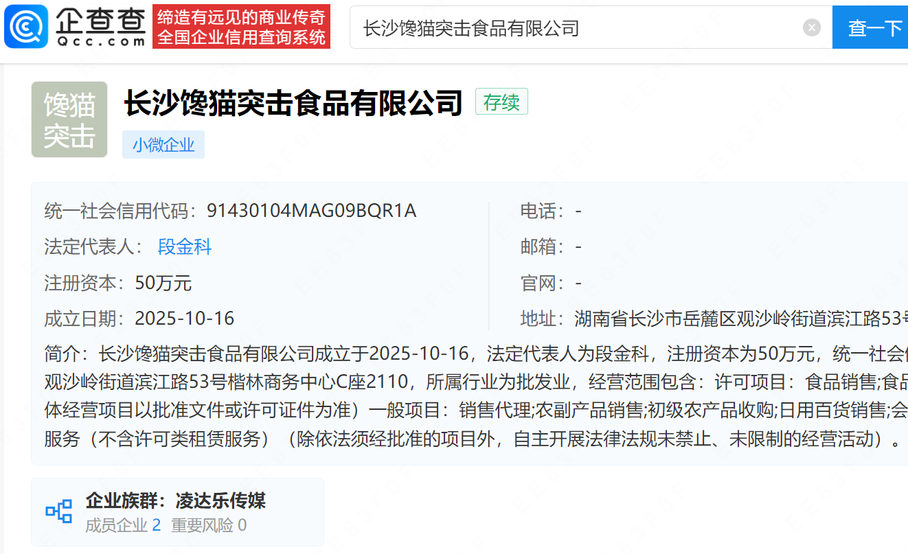 近日,长沙馋猫突击食品有限公司成立,法定代表人为段金科,注册资本50万元,经营范围包含食品销售、食品互联网销售、初级农产品收购等;企查查股权穿透显示,该公司由凌达乐(鹿哈)间接持股99%。值得注意的是,今年8月,凌达乐名下的湖南凌达乐食品有限公司刚注销。